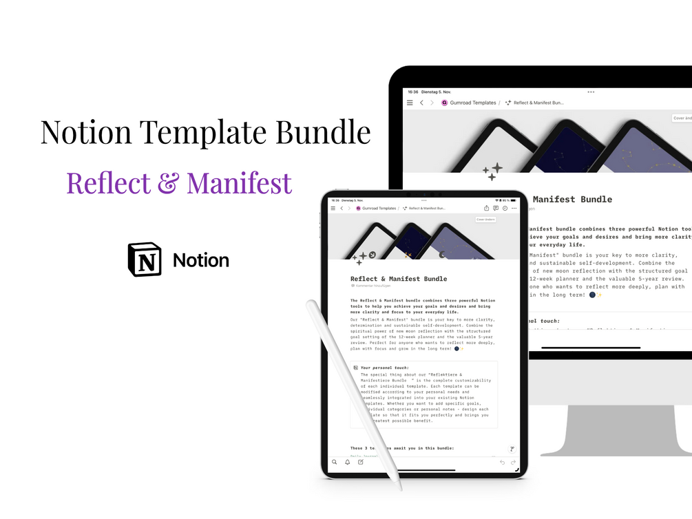 The "Reflect & Manifest" bundle combines three powerful Notion tools that will help you achieve your goals and wishes and give your everyday life more clarity and focus.